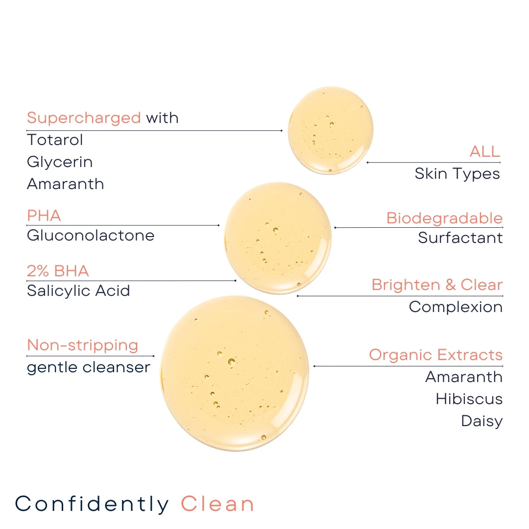 Aqua, Glycerin (Vegetable Derived), Sodium Hydroxypropylsulfonate, Laury glucoside Crosspolymer, Sodium Coco-Glucoside Tartrate, Cocamidopropyl Hydroxysultaine, Sodium Cocoamphoacetate, Bellis Perennis Flower (Daisy) Extract, Sodium Cocoyl, Hydrolyzed Amaranth Protein, Salicylic Acid (BHA 2%), Lauryl Glucoside, Gluconolactone (PHA), Citrus Paradisi Peel (Grapefruit) Extract, Totarol, Hibiscus