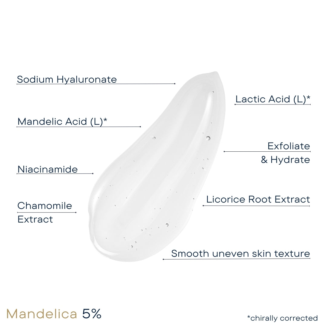 Mandelica™ works on two levels, acting as both a gentle exfoliant and an antibacterial agent. Its exfoliating properties support healthy skin renewal by removing dead skin cells, keeping pores clear to prevent breakouts, and improving skin texture. Unlike other treatments, it penetrates the skin slowly and uniformly due to its large molecular size, making it ideal for sensitive skin and safe for all skin tones. Mandelica™ is also an excellent alternative to steroids and hydroquinone for treating hyperpigmentation, while being gentle enough for those with conditions like acne rosacea.