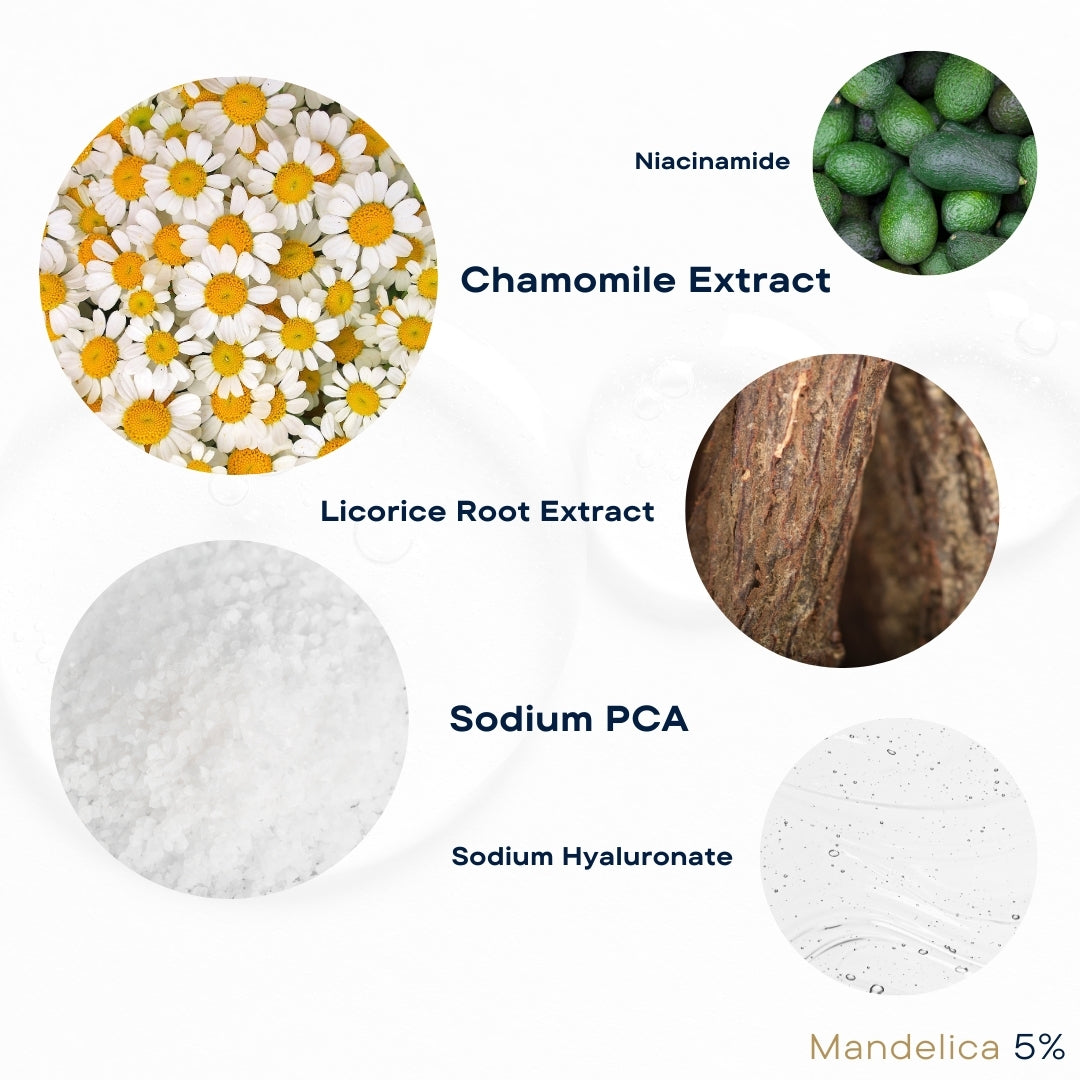 Aqua, Sodium Hyaluronate (L), Mandelic Acid (L), Hydroxyethylcellulose, Sodium PCA (L), Glycerin, Niacinamide, Lactic Acid (L), Butylene Glycol, Citric Acid, Hydroxypropylcellulose, Glutathione (L), Allantoin, Panthenol (D), Glycyrrhiza Glabra (Licorice) Root Extract, Bisabolo (L-alpha), Caprylyl Glycol, Alcohol Denat, Sodium Benzoate, Ethylhexylglycerin.